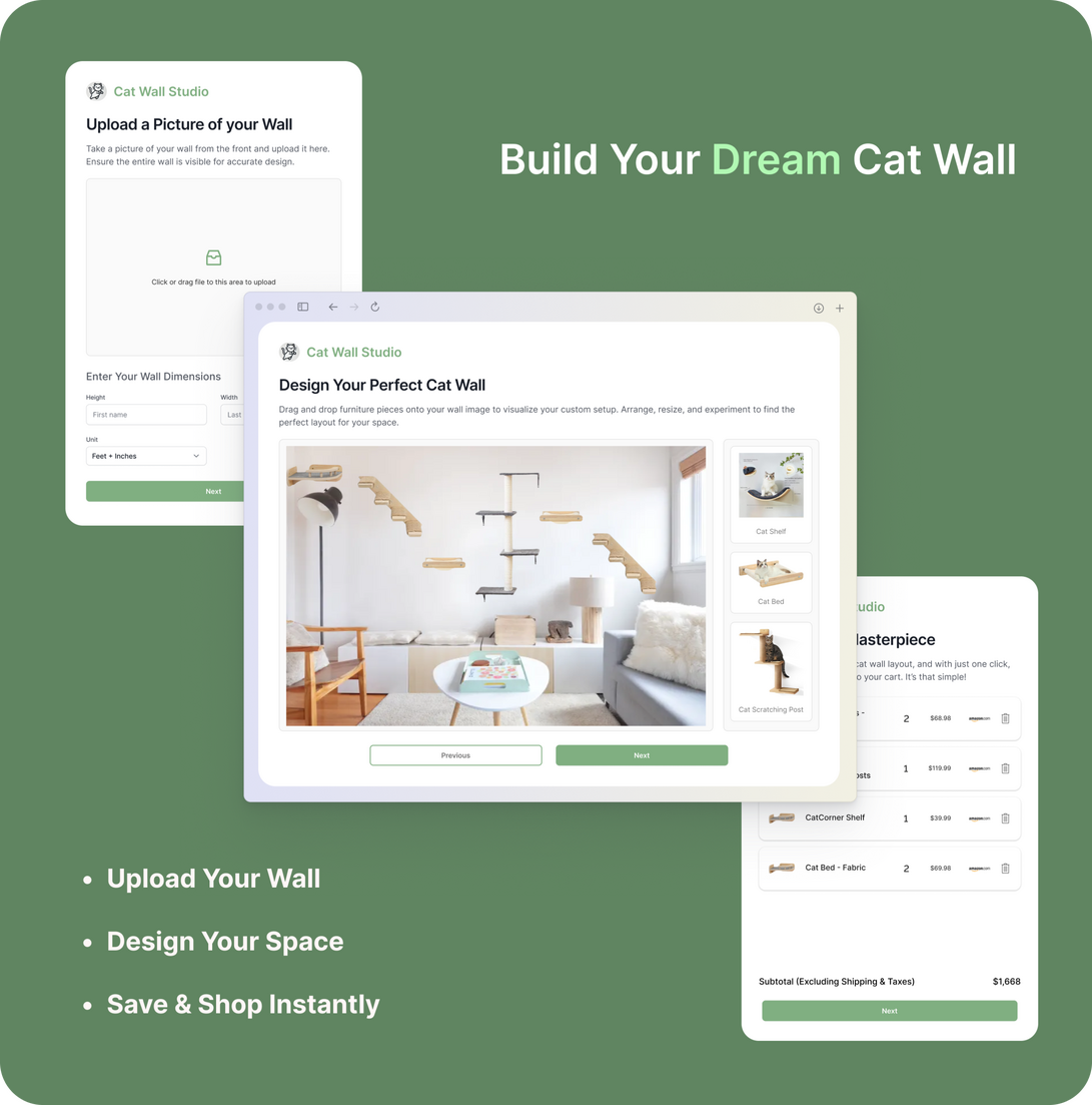 Designing the perfect wall-mounted playground for your cat has never been easier. With Cat Wall Studio, you can bring your vision to life in just three simple steps.